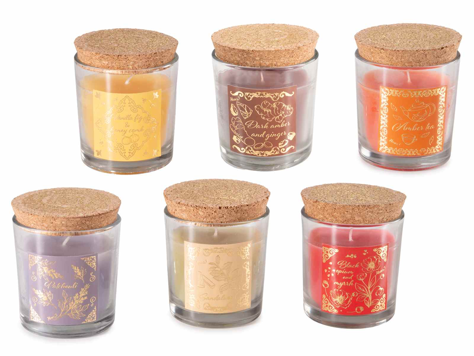 Candela profumata in vasetto di vetro e coperchio in sughero.