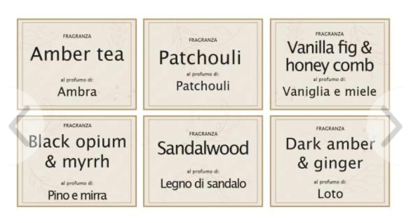 Fragranze: Black Opium And Myrrh, Dark Amber & Ginger, Amber Tea, SandalWood, Vanilla Fig & Honey Comb, Patchouli