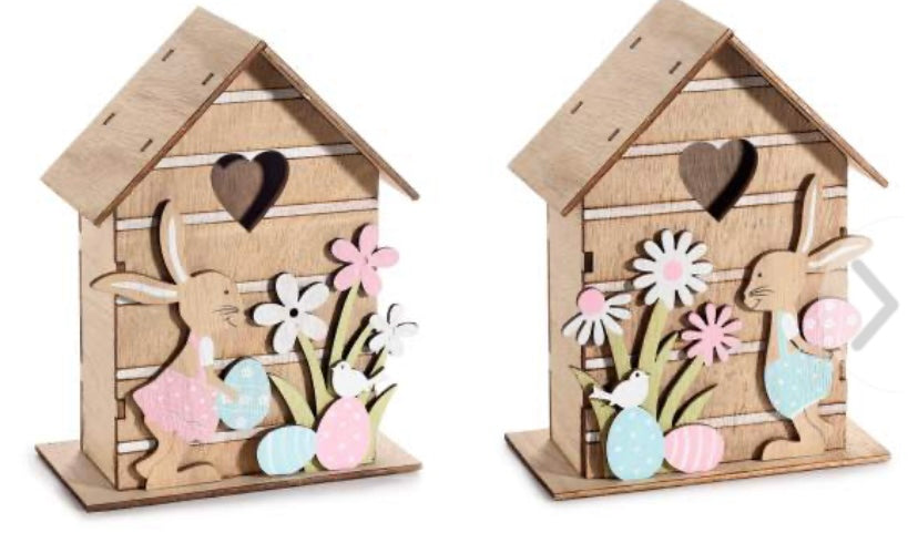 Casetta in Legno , con coniglietto, cuore e fiori.