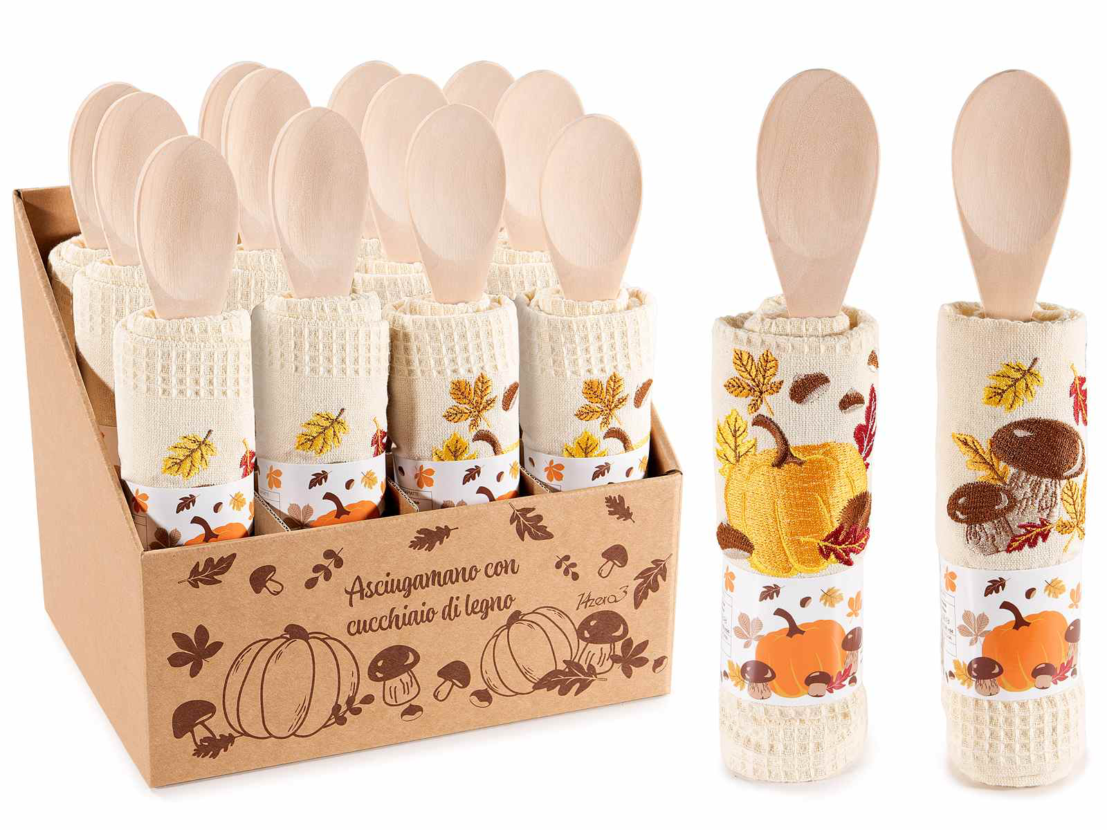 Cucchiaio in legno con asciugapiatti in cotone e ricamato.