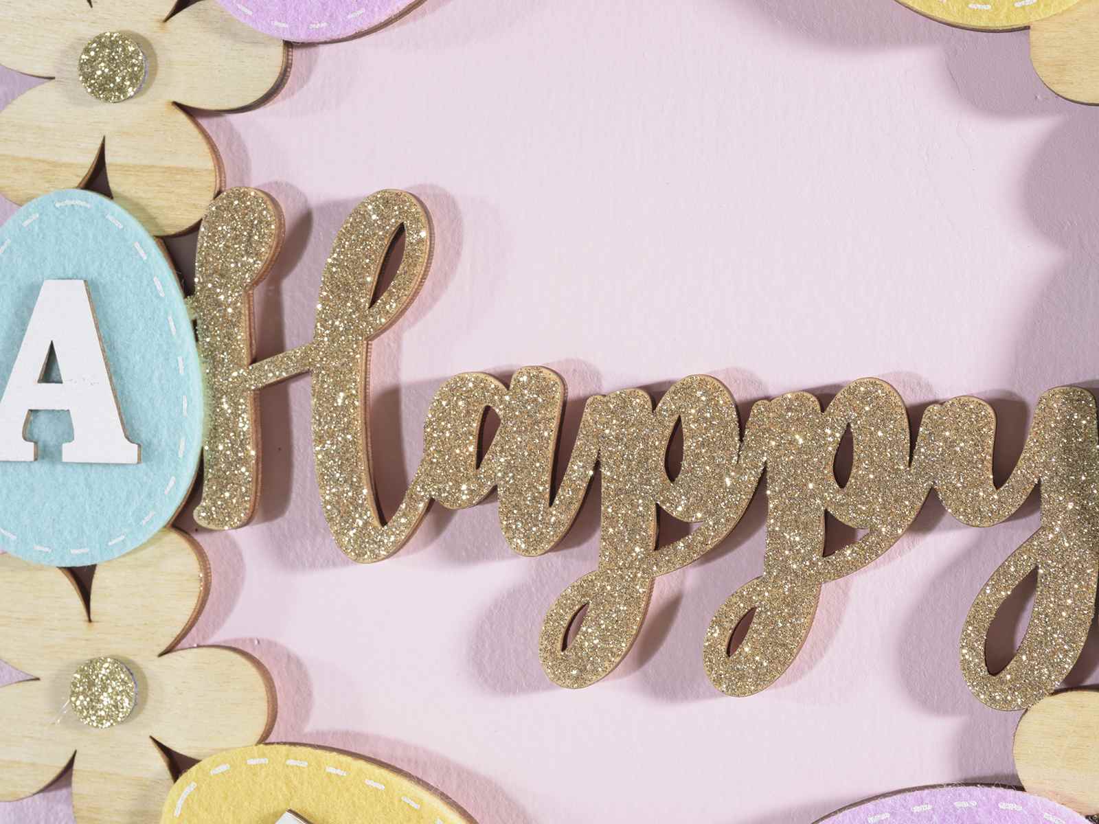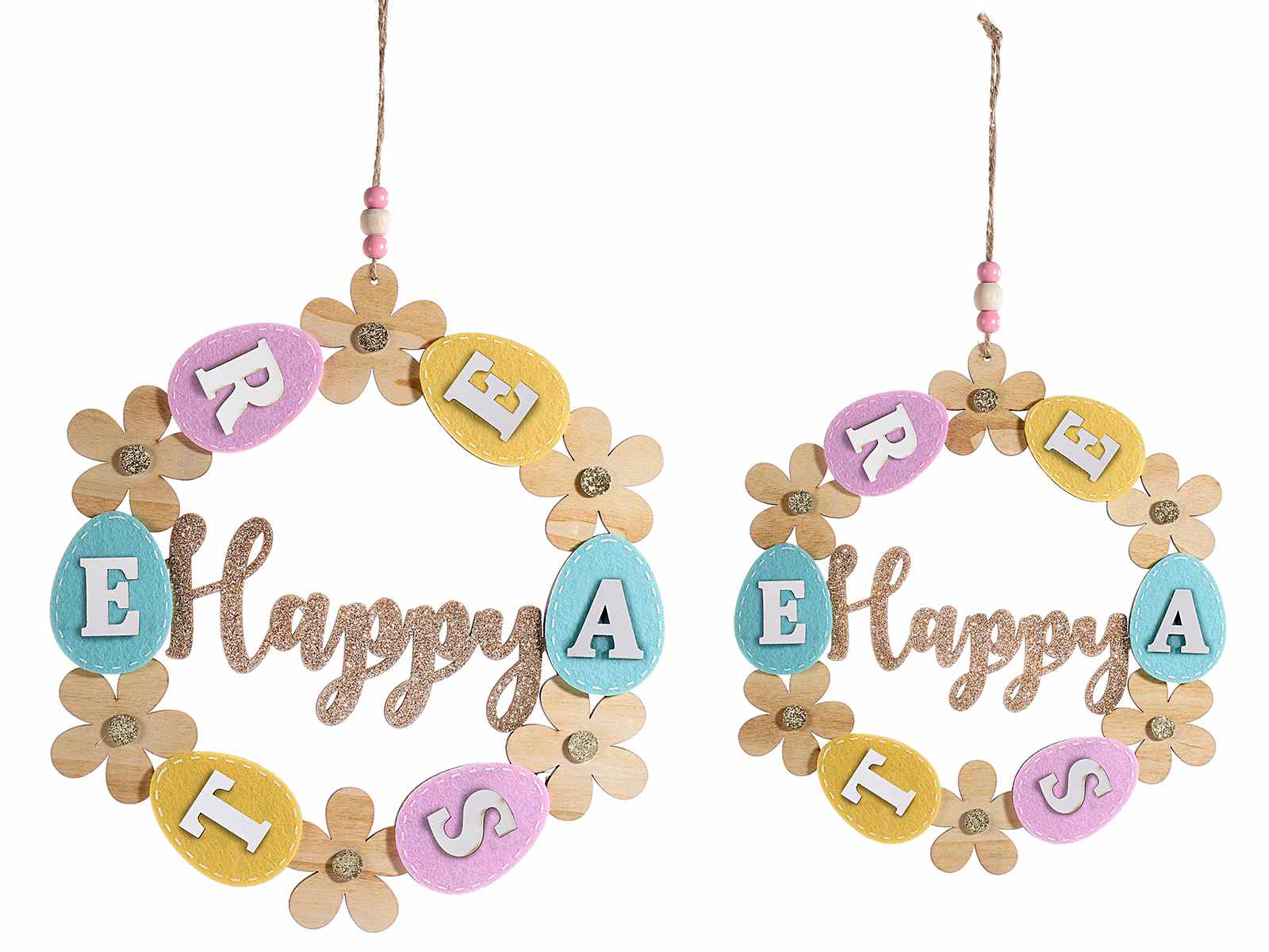 Ghirlanda Pasquale in legno con decori in stoffa e scritta glitterata dorata.