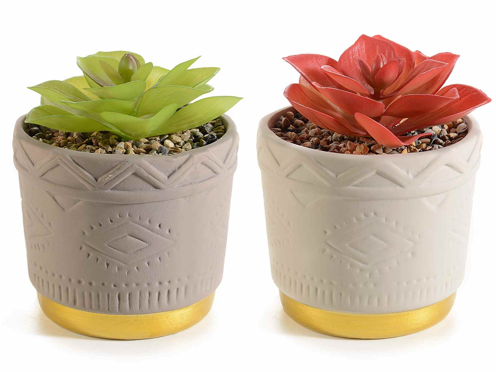 Vasetto in ceramica lavorata, base dorata e piantina artificiale.
