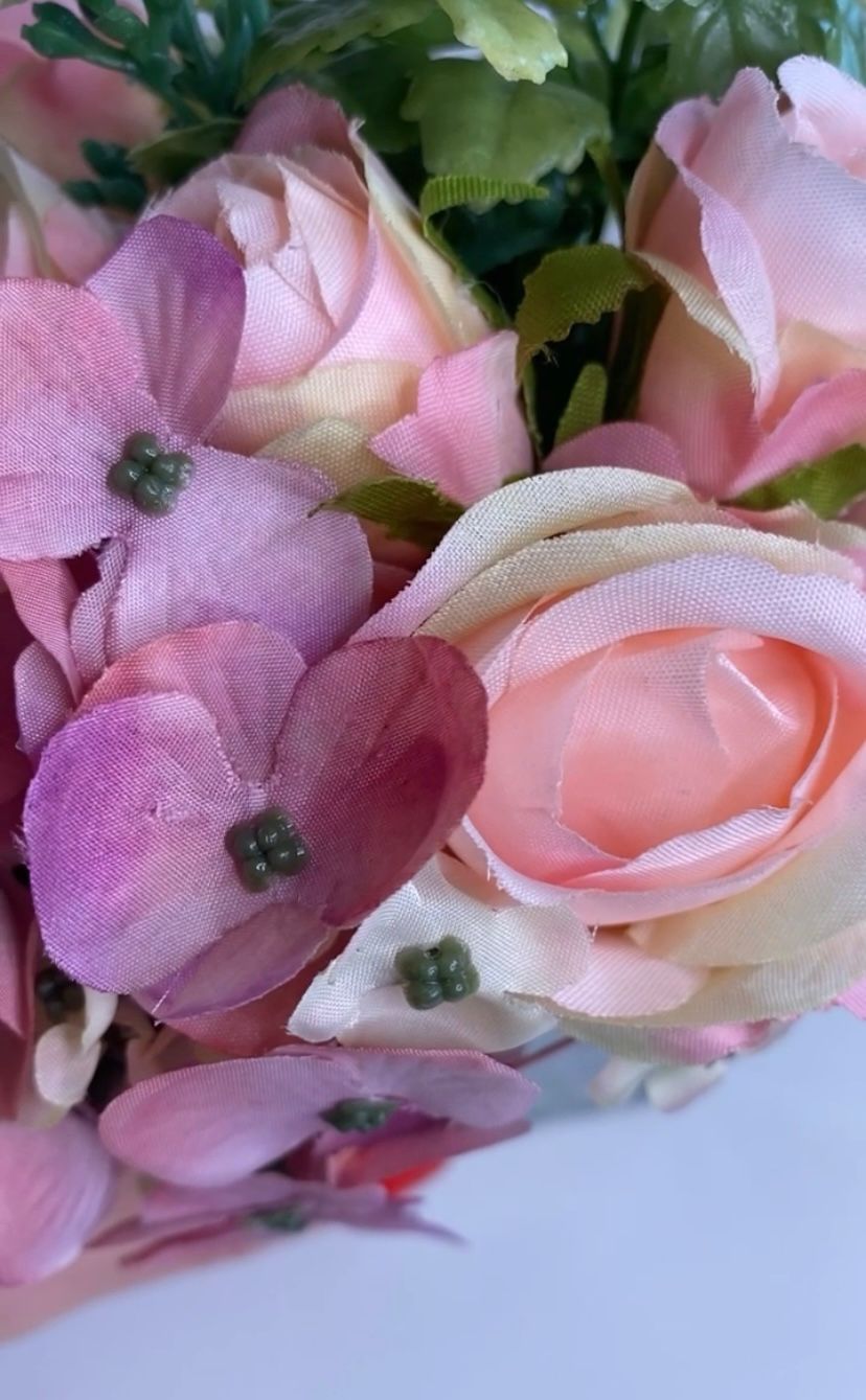Fiori in stoffa, fogliame in plastica
